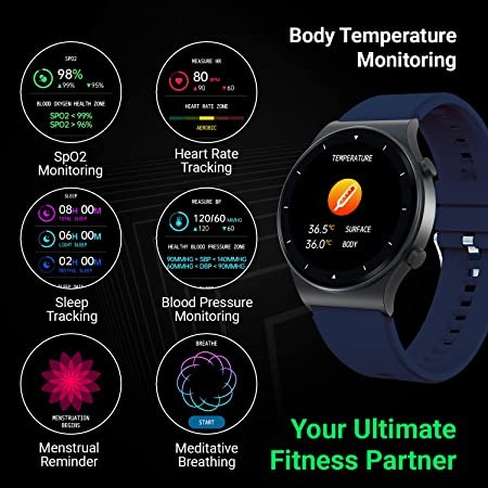 | Special Features | SPO2, Blood Pressure Monitoring, Heart Rate Monitoring, Temperature, Breathe Monitoring, Sleep Monitoring, Steps Tracking, Pedometer, Calorie Tracker, Distance Tracker, Bluetooth Calling, Add Contacts, Dialpad, Local Music Storage, Connect to Earpods, Inbuilt Mic and Speakers, 7 Workout Modes, IP68 Water Resistant, Smart Notifications, Music & Camera Control, Inbuilt Mic & Speaker, Time Display, Battery - 10 Hrs Using Blutooth Calling, 10 Days Regular Use, 30 Days Stand By, Sedentary Reminders, Gesture Control, Honeycomb Menu, Dual Button System, Rotating UI Interaction, Inbuilt Games, Acceleromater, Activity Tracker, Alarm Clock |