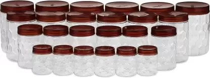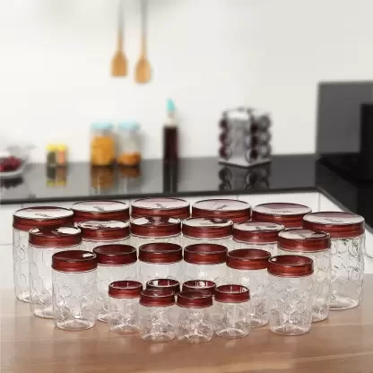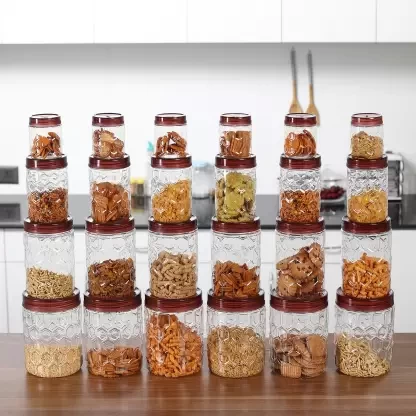 Each box contains 24 units of plastic jars of different sizes: 6x 270 ml, 6 x 665 ml, 6 x 1240 ml and 6 x 1850 ml size plastic storage Jars ; Color: Transparent ; Material: Plastic ; Non-stick: No, Made of 100% Food Grade & BPA Free plastic, These airtight jars are perfect for storing essential edibles, like Pulses, spices ,varieties of food grains, snacks etc by maintaining the crispness & freshness intact for long time, The glass like transparency helps in spotting things easily and labelling is not required for the food kept inside and trendy design enhance your kitchen décor, These Jars help in organising your kitchen by saving space as can be stacked one over others and can be kept nested form when not in use, Clear, transparent body and even see through Lid makes the kept things easy to identify without having to open the lid, These jars are odourless and airtight which ensures the freshness of content fresh and intact for long time