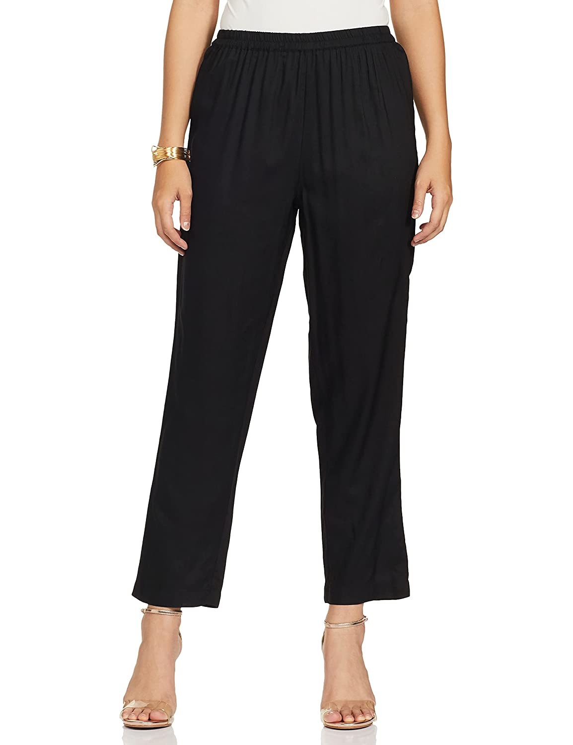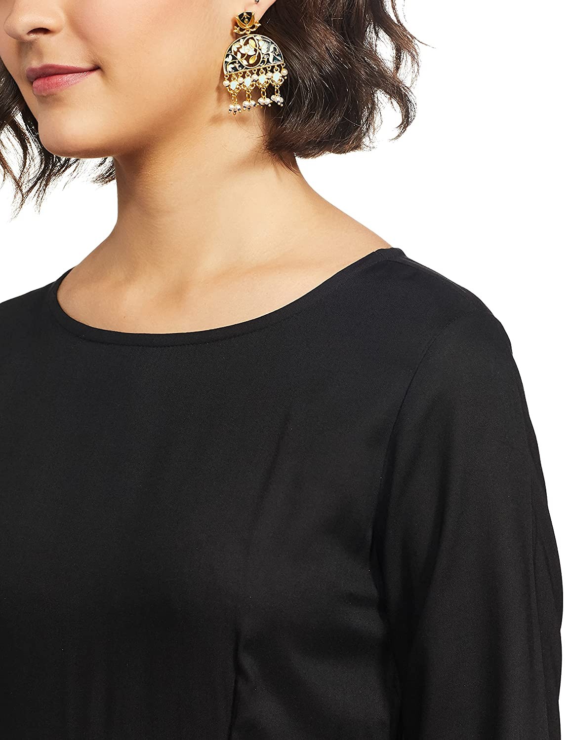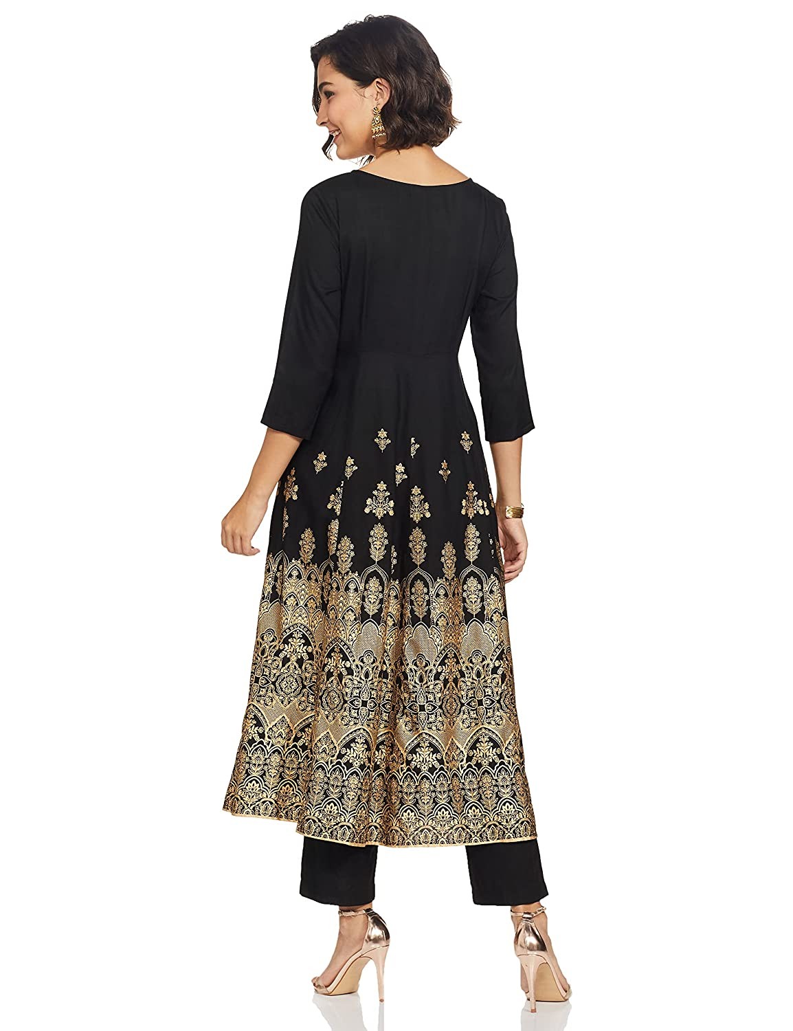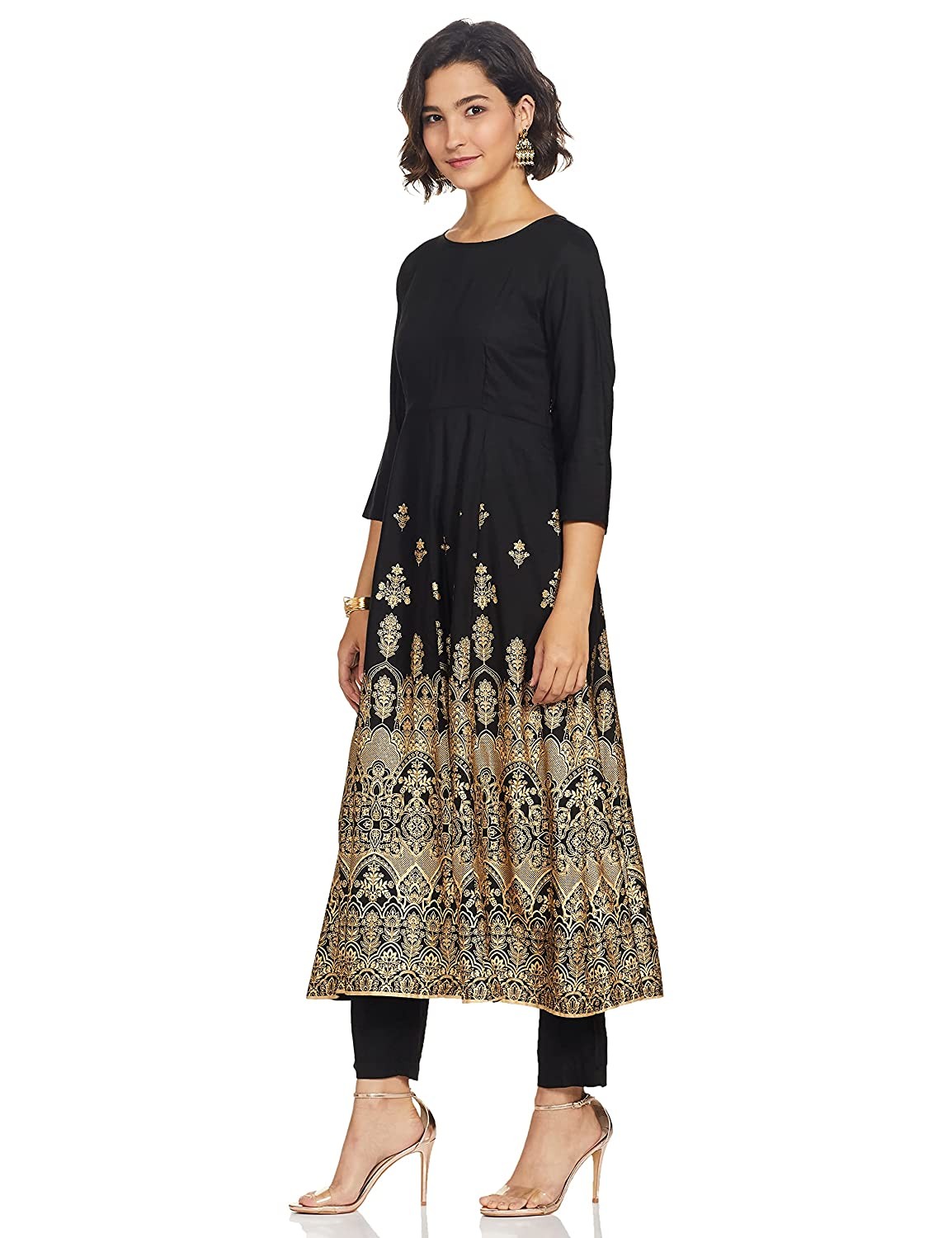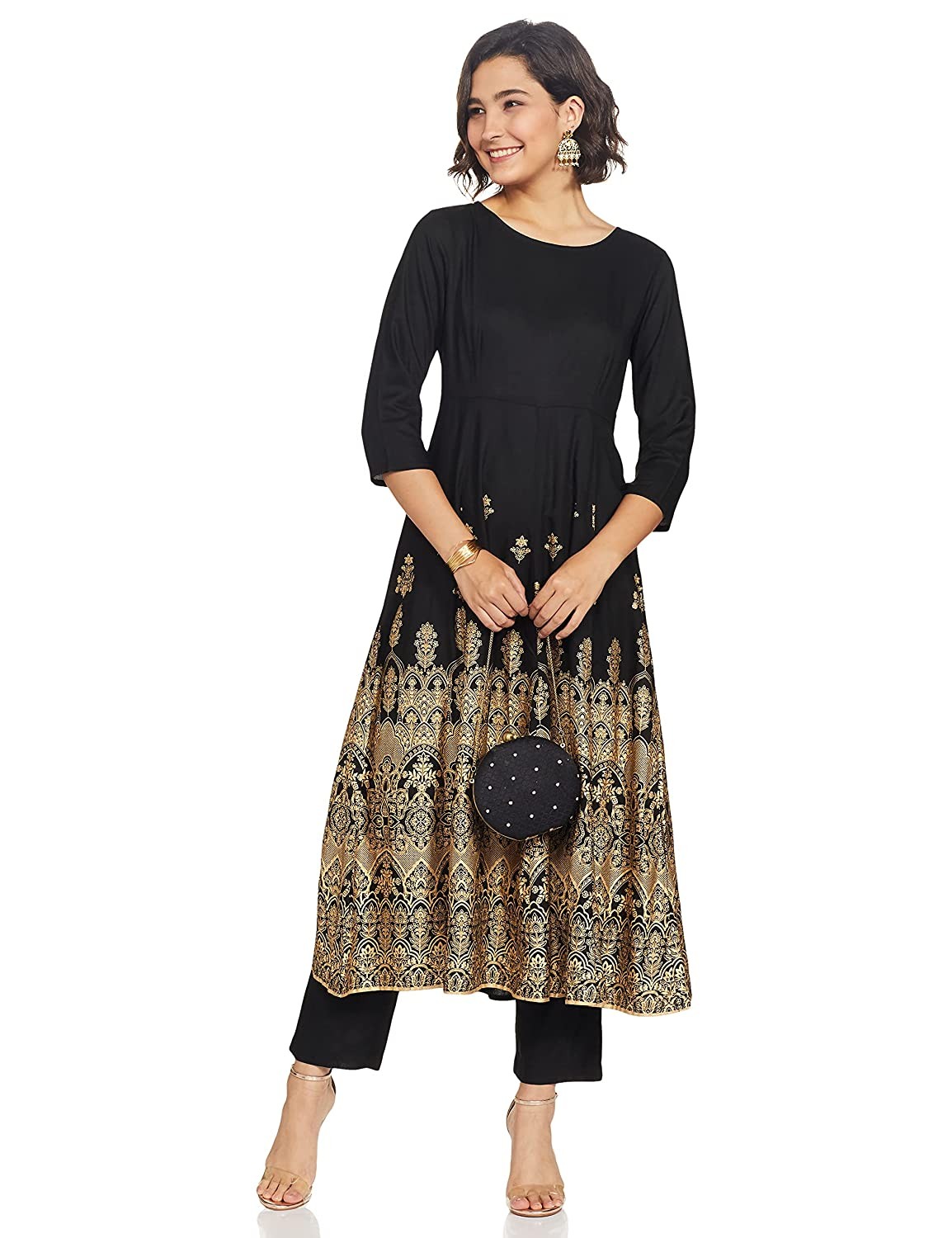 • Printed round neck kurta with three quarter sleeve and border detail Solid cigarette pants