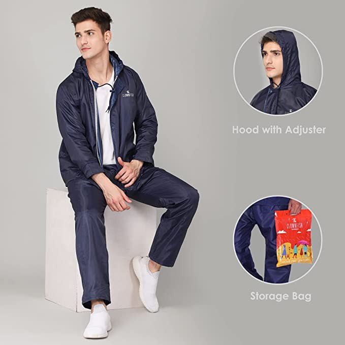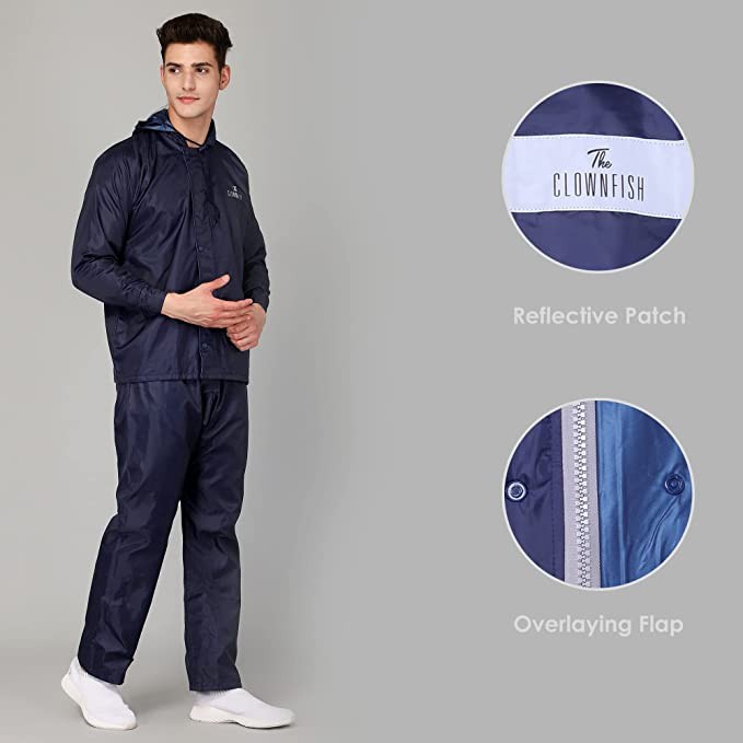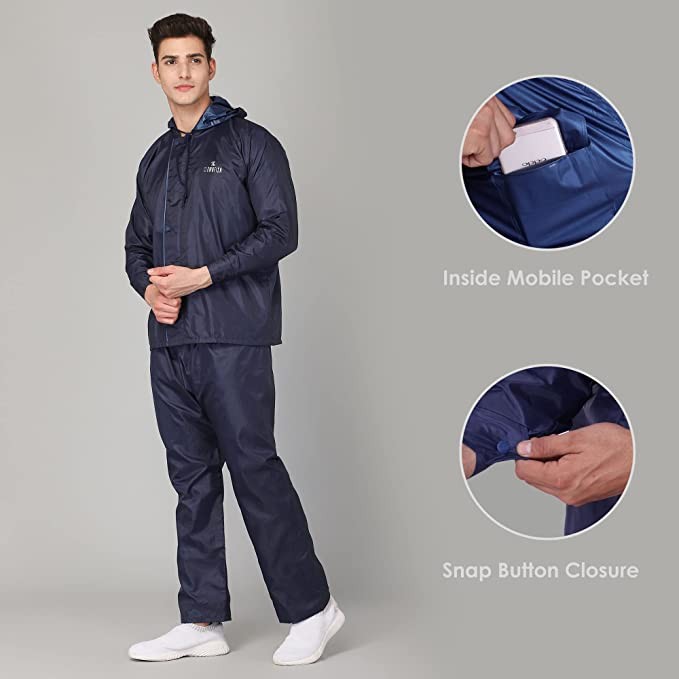 Construction: This Reversible Use Rainwear is made from double layered polyester fabric. Every joint is seam sealed with additional leak proof stitching making it completely waterproof. Overlaying flap with snap buttons over zippers prevents water seepage. It also comes with high collars, adjustable hood and side pockets with flaps for added protection. Small inner pocket to protect mobile or any other expensive items.Good quality elastics in trousers makes it super comfortable to wear.