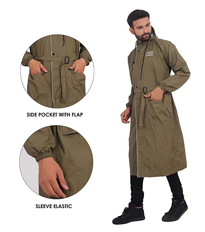 Construction: This Reversible Use Rainwear Is Made From Double Layered Nylon Fabric. Every Joint Is Seam Sealed With Additional Leak Proof Stitching Making It Completely Waterproof. Overlaying Flap With Snap Buttons Over Zippers Prevents Water Seepage. It Also Comes With High Collars, Adjustable Hood And Front Pockets With Flaps For Added Protection. Additional Waist Strap For A Smarter Look.