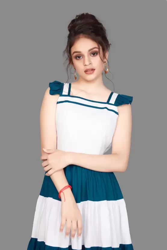 "Spruce up your wardrobe with this midi length dress from Fashion Dream available on flipkart. This fit and flare dress has color block tier pattern as pattern type and is perfect for a day out with friends or a nigh get-togethers with family. This midi length white and blue dress is made with crepe fabric, which is soft and smooth. It features a square neck with beautiful stylish cap sleeves in it and skirt with tiers pattern. Self fabric belt with this dress is for fitting. This stunning fit and flare dress is especially made for summer and spring season."