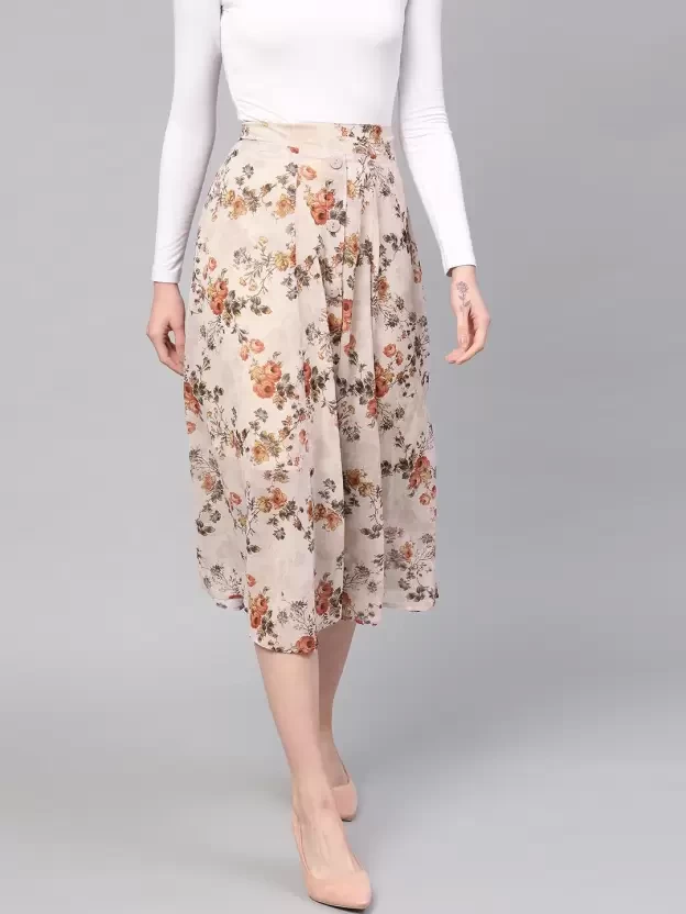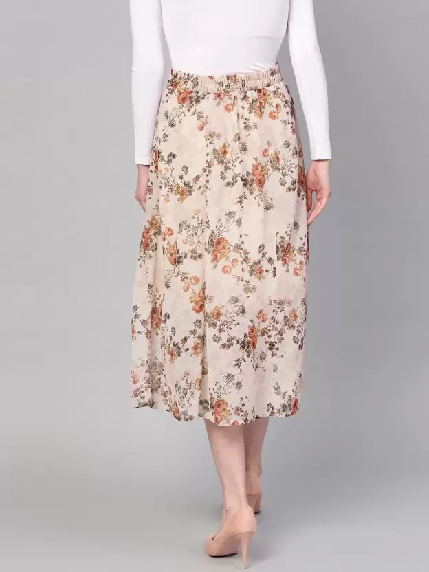 Taupe Floral A-Line Skirt , in Georgette fabric, Polyester, Midi Length , Fit & Flare, Elasticated waist line , Flared Hemline and features Mock Bottom Placket At Front