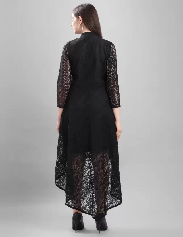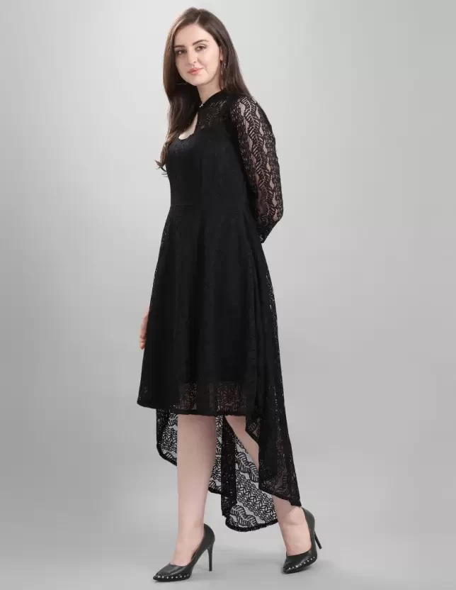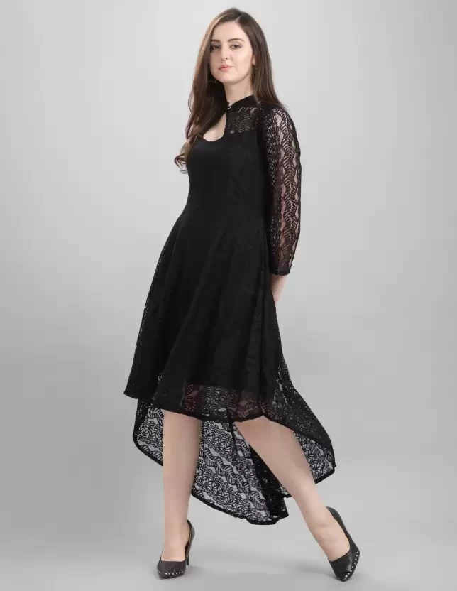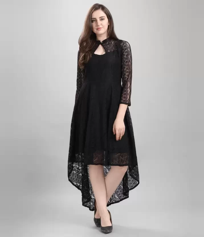 Black High Low Russel Net Below Knee Dress with Stylish Keyhole Neck and 3/4 Sleeves