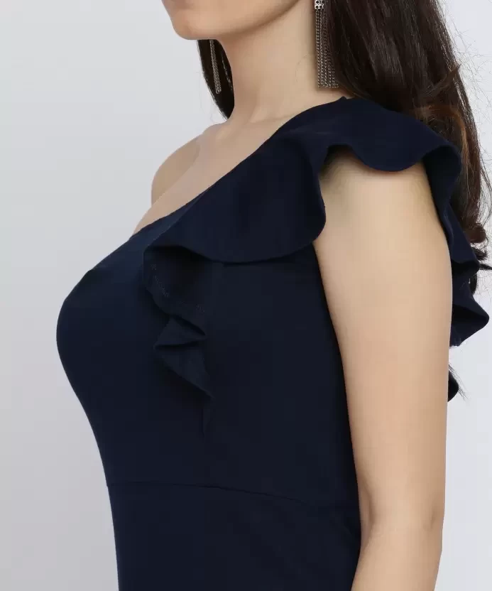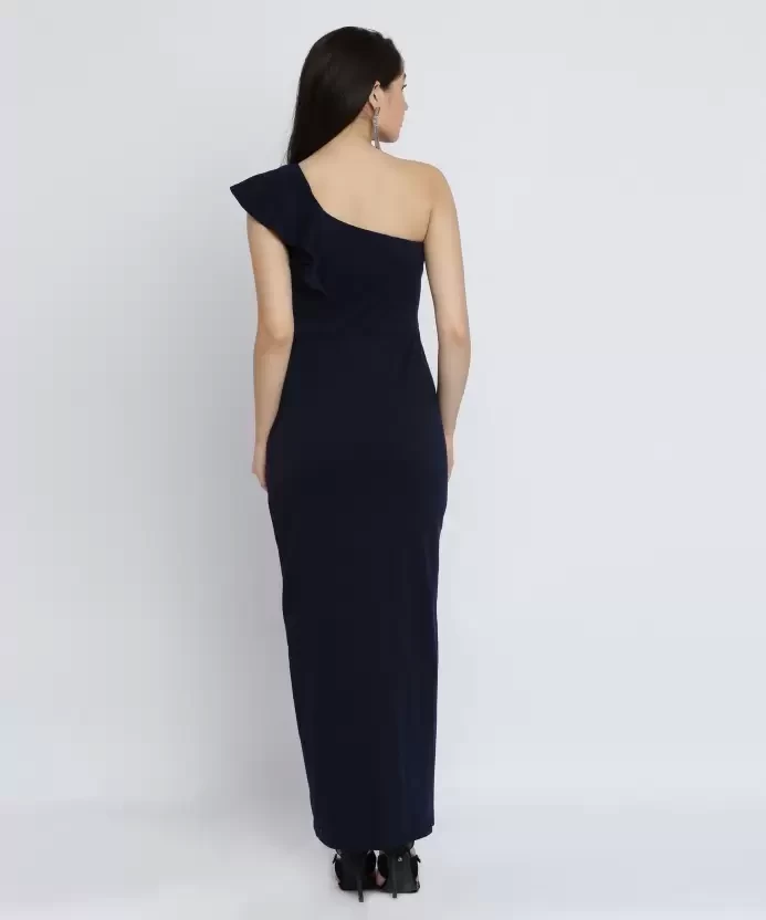 Navy blue knitted cotton solid ruffled slim fit one shoulder maxi dress, Is sleeveless and has a zip closure