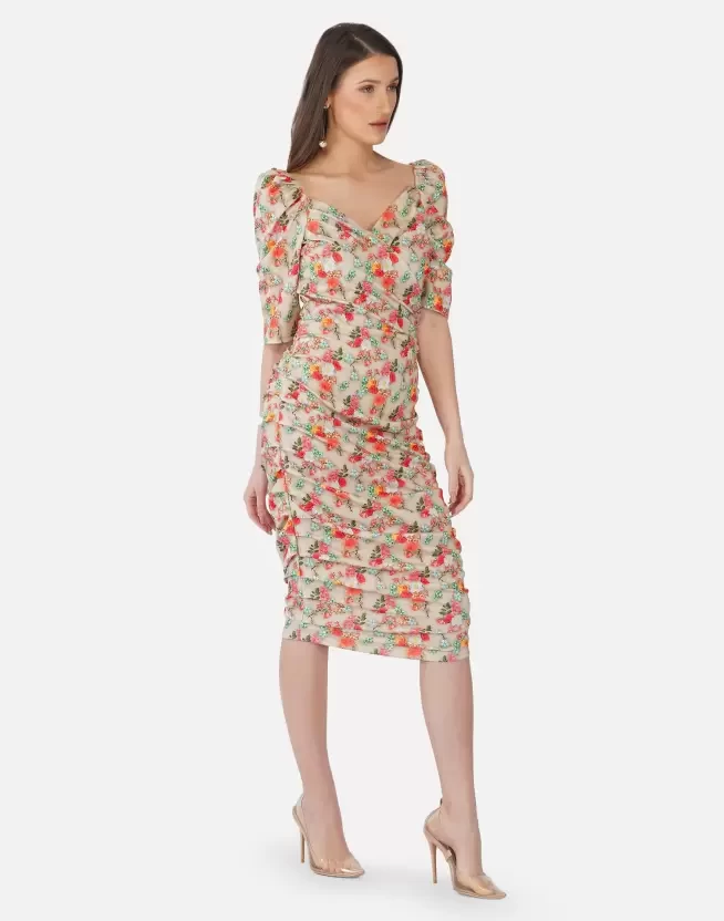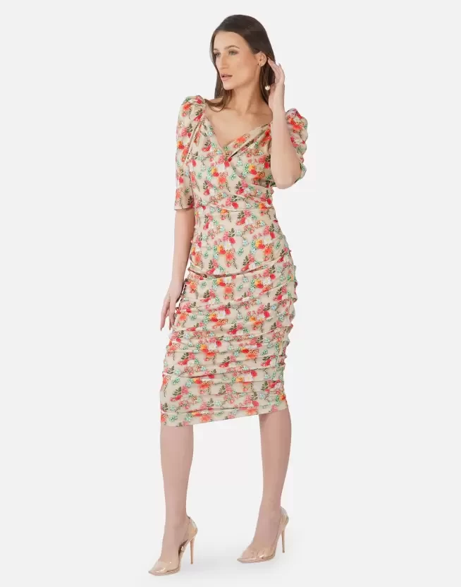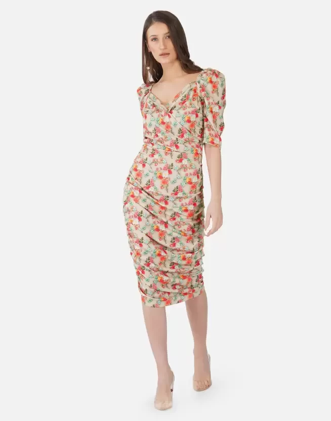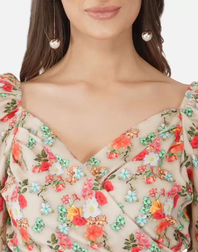 Beige Floral Printed Bodycon Dress, has a Sweetheart neck, Half- puff sleeves, Below knee length in stright hem, cotton lycra blend fabric, This dress from SELVIA offerings will take your personal style to new heights. Wear your printed beige piece with strappy heels and your favourite clutch for a night out on the town with your friends.